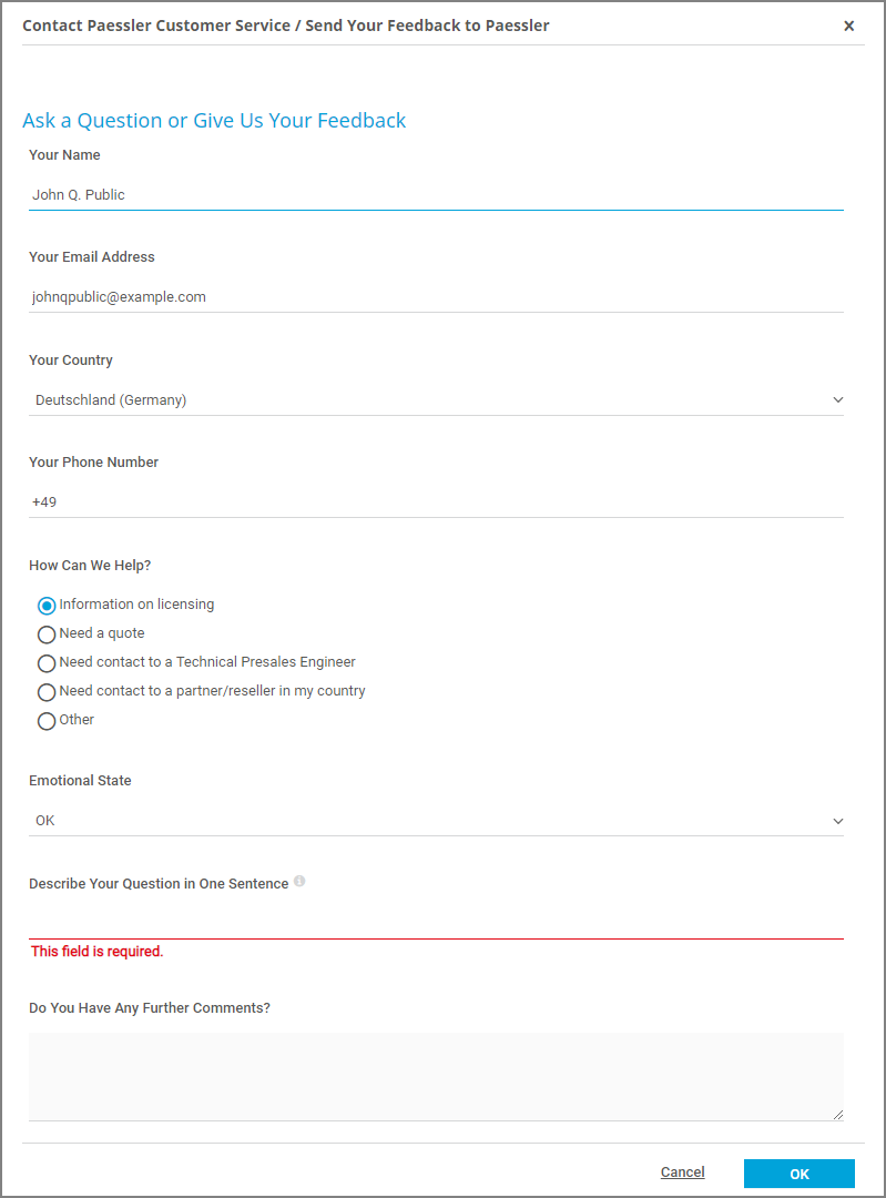 Click OK to send your question or feedback to our customer service. Click Cancel to close the customer service contact form without sending it.