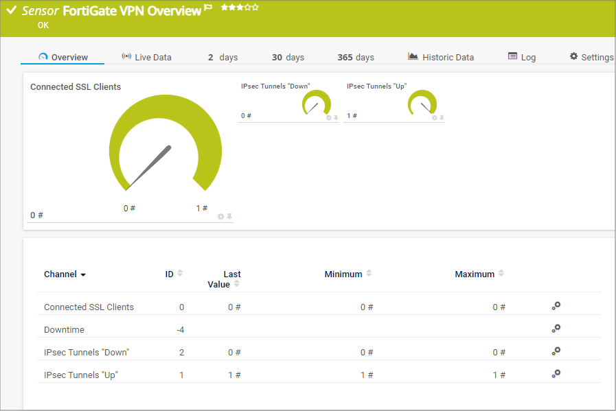 The FortiGate VPN Overview sensor monitors the virtual private network (VPN) connections of a Fortinet FortiGate system via the Representational State Transfer (REST) application programming interface (API).