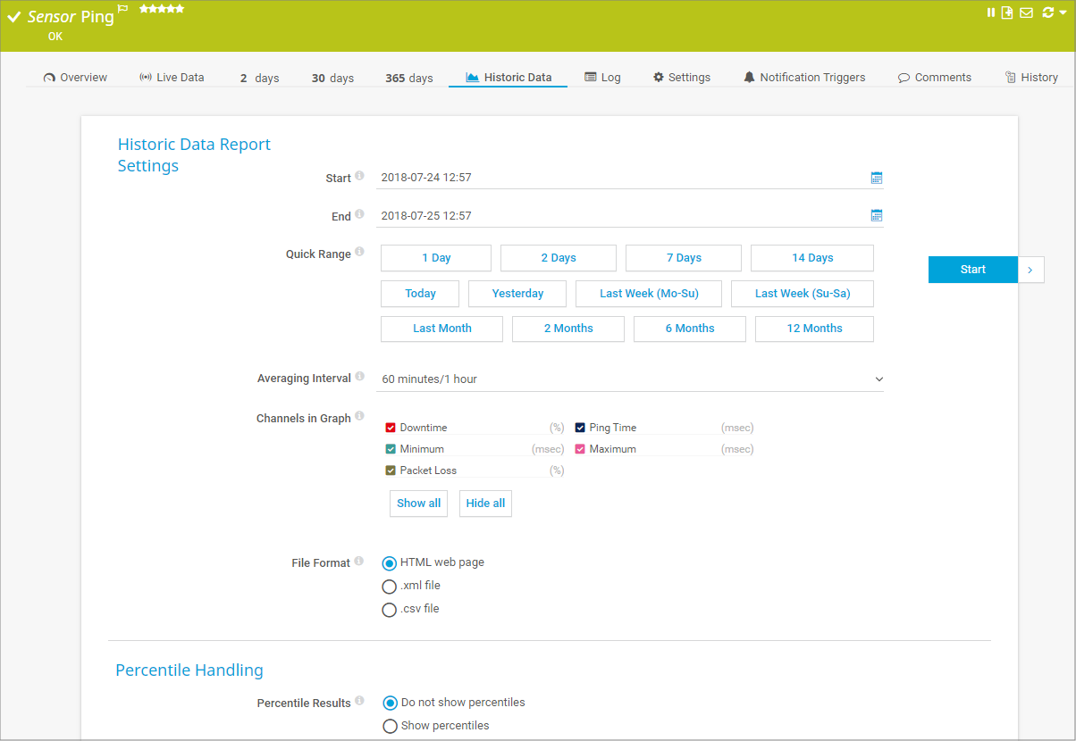 Show percentiles: PRTG displays an additional percentile calculation for the primary channel in the value table for each scanning interval.