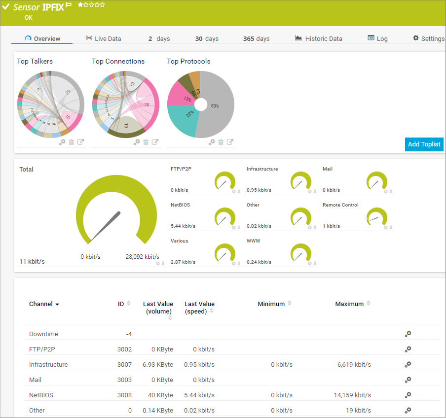 For all Flow (NetFlow, jFlow, sFlow, IPFIX) and Packet Sniffer sensors, Toplists are available on the sensor's Overview tab. Using Toplists, you can review traffic data for small time periods in great detail.