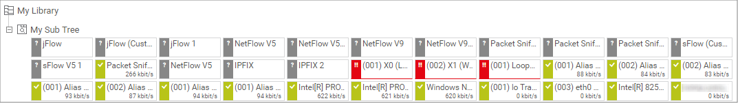 • When you select Show a collection of filtered sensors, PRTG only shows the sensors that are underneath the Linked Object in the device tree without probes, groups, and devices. You can additionally filter for certain sensor types, states, and tags. PRTG then only shows matching sensors. In the example screenshot, you can see the library node My Sub Tree where only bandwidth sensors are shown.