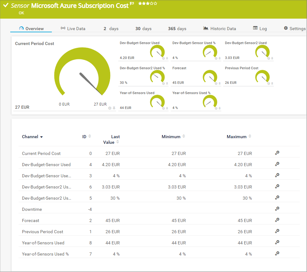 In the channel table on the Overview tab, this channel never shows any values. PRTG uses this channel in graphs and reports to show the amount of time in which the sensor was in the Down status