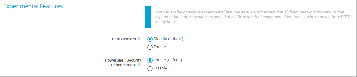 The operating methods of the experimental features might change at any time. Do not expect that all functions work properly, or that the experimental features work as expected at all. Be aware that Paessler might remove these features at any time.