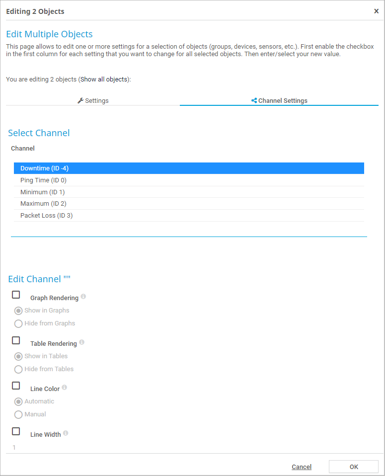 The Channel Settings tab in the Edit Multiple Objects dialog is only available when you edit multiple sensors. The available settings depend on the selected sensors. You can edit the settings of all channels that the selected sensors have in common. Select a channel name from the Channel list. You can then edit display settings, colors, scaling, and limits, for example.