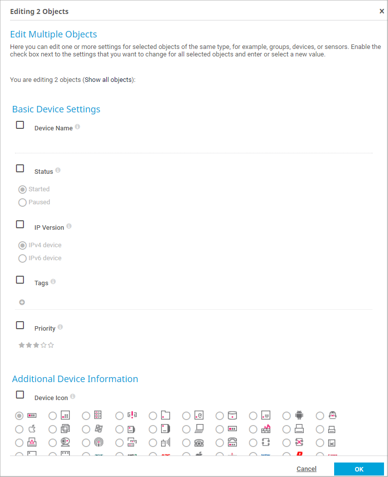 Click b_multi_edit_settings in the multi-edit menu to open the Edit Multiple Objects dialog. This dialog shows most of the settings that the selected objects have in common. For example, you can edit the name, tags, priority, scanning interval, or access rights. The available options depend on the selected objects.