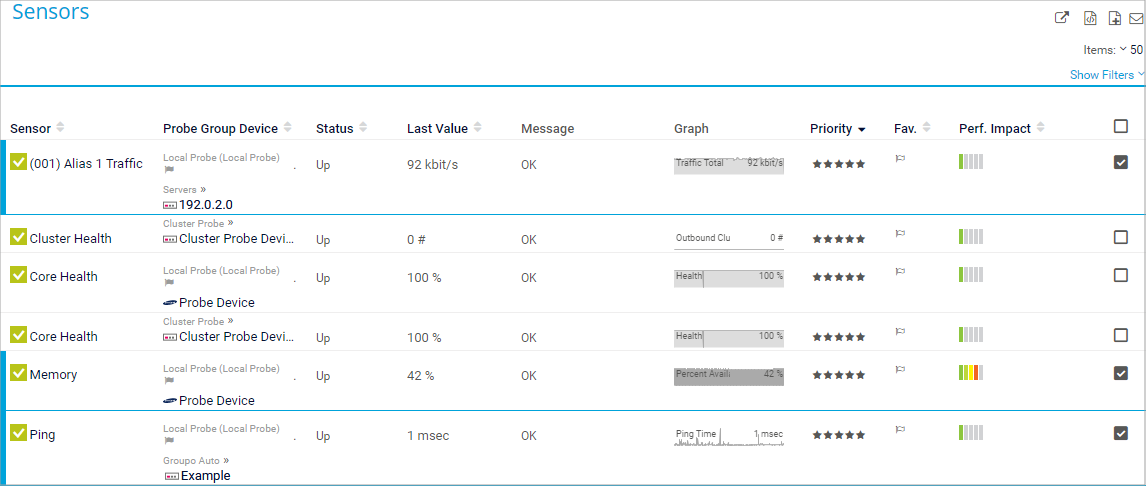 When you select one or more objects, the multi-edit menu appears in which different functions are available. The available menu options depend on the selected objects. For sensor lists, for example, some frequently used functions are Pause (b_multi_edit_pause), Resume (b_multi_edit_resume), Scan Now (b_multi_edit_scan), Delete (b_multi_edit_delete), or Settings (b_multi_edit_settings). Click a button to apply the respective function to all selected objects.