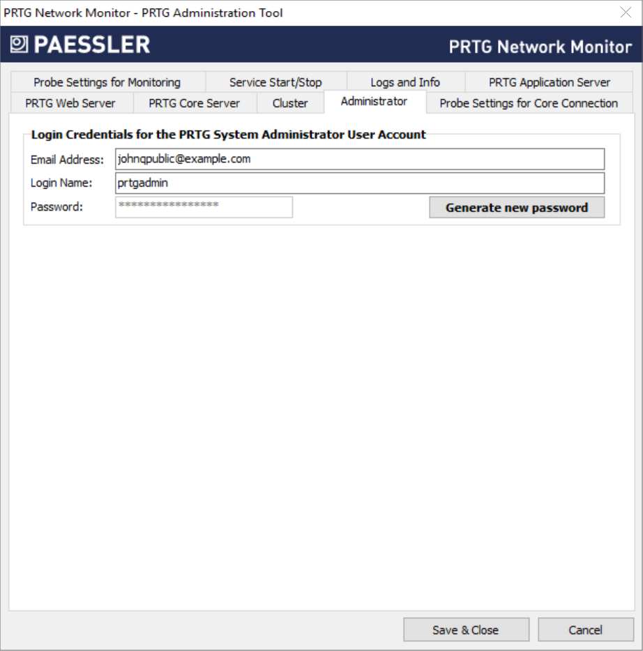 Click Generate new password and confirm to generate a new password for the PRTG System Administrator user account. Click Save & Close to set the new password. You use it when you log in to the PRTG web interface or PRTG app for desktop.