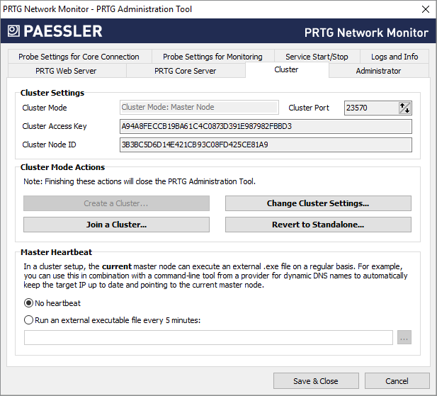 On the Cluster tab, you can change how the PRTG core server behaves in a cluster. Before you change settings here, see section Failover Cluster Configuration.