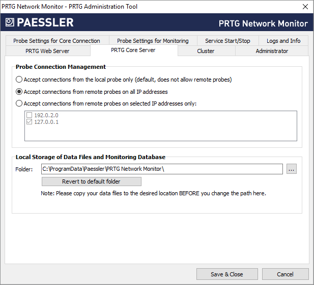 Accept connections from remote probes on all IP addresses: Accept incoming connections from remote probes, no matter on which IP address of the PRTG core server they come in.