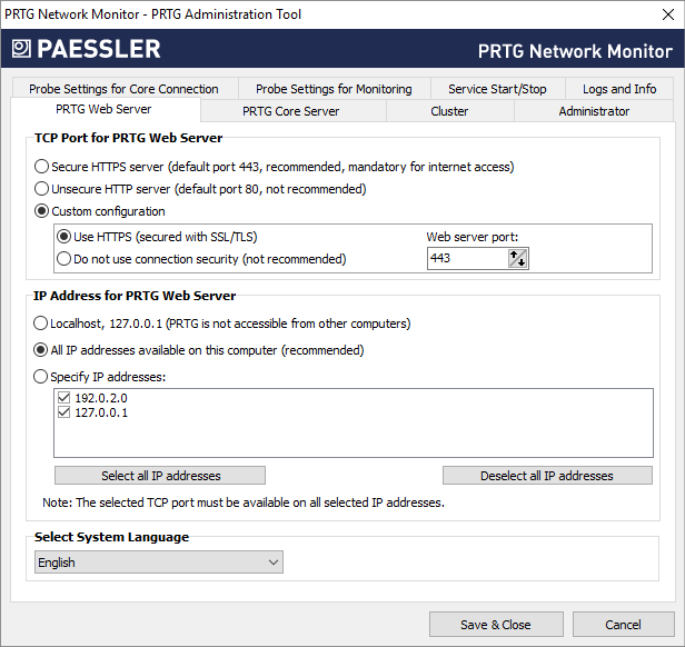 Specify IP addresses: Select specific IP addresses on which the PRTG web server runs. The list is specific to your setup. Enable check boxes in front of every IP address that you want the PRTG web server to be available at. You can also select all IP addresses by clicking the Select all IP addresses button or deselect all addresses by clicking the Deselect all IP addresses button. Either the selected port or at least one port in the range from 8080 to 8089 must be available on the specified IP address.