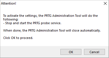 After you change settings, click Save & Close. A new window opens where PRTG asks you to agree to restart the PRTG probe service. Click OK to proceed.