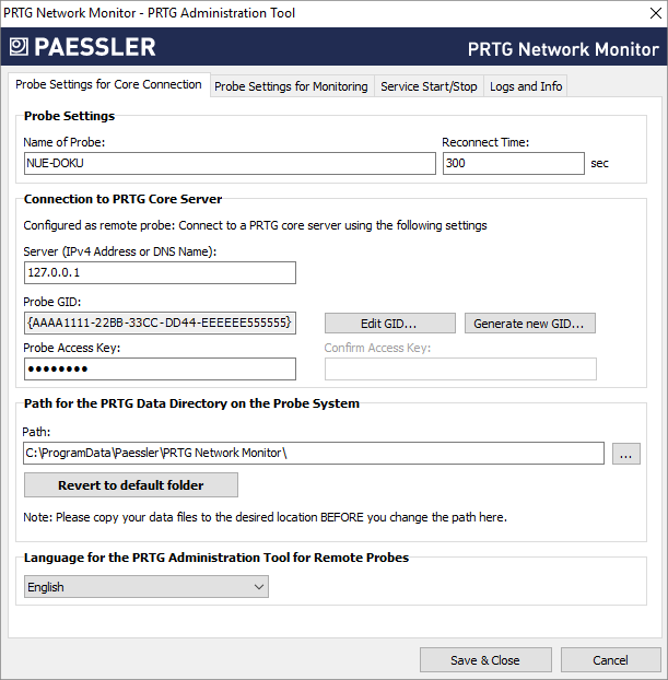Choose the language for the PRTG Administration Tool on the remote probe. The default is English.
