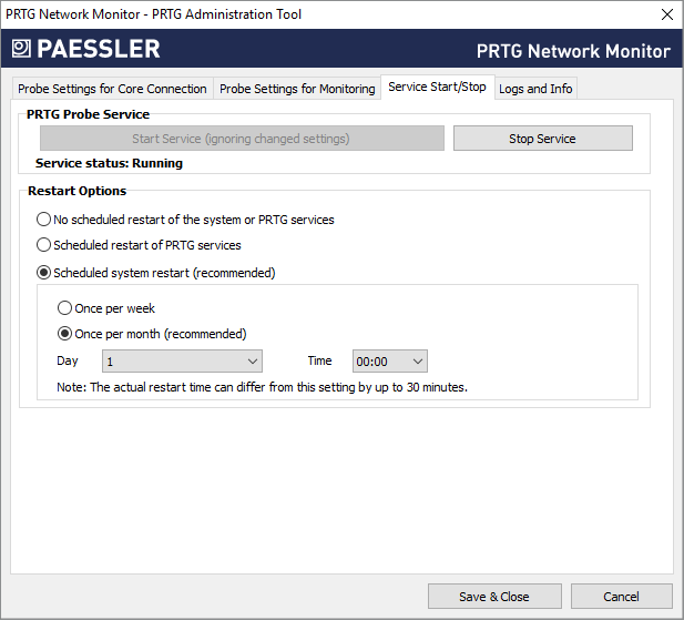 No scheduled system or service restart: Do not automatically perform a scheduled restart of services. We recommend that you manually restart the PRTG core server system every few weeks. You can initiate a restart of the PRTG probe service in the Administrative Tools in the PRTG web interface.