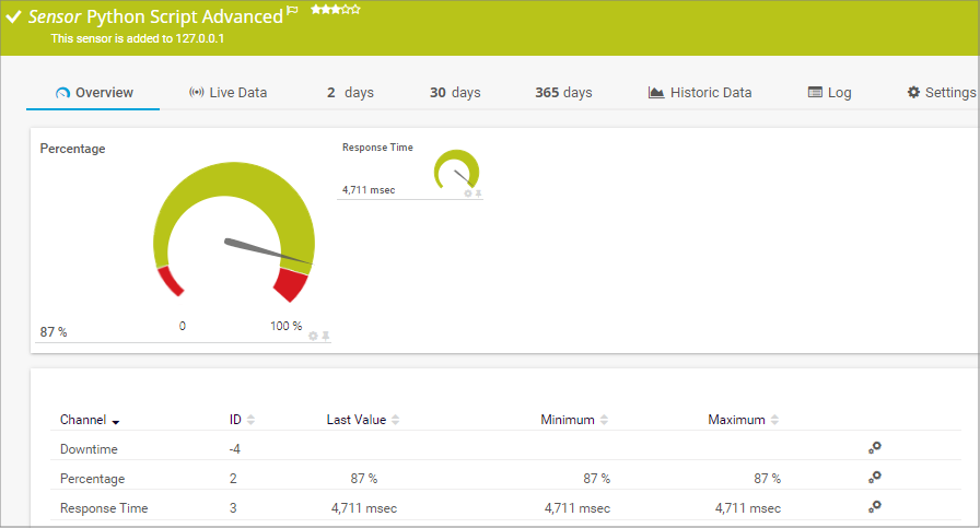 In the channel table on the Overview tab, this channel never shows any values. PRTG uses this channel in graphs and reports to show the amount of time in which the sensor was in the Down status