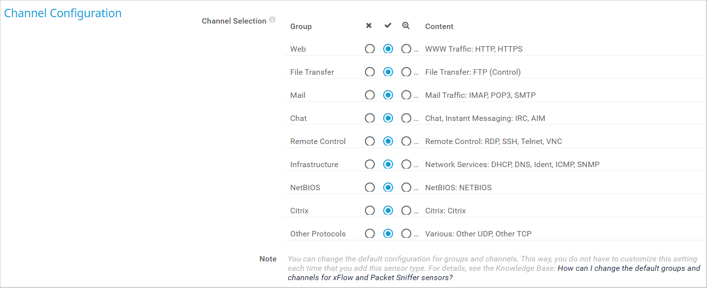 For each group, you can select how many channels the sensor uses, that is, how detailed the sensor divides the traffic. For each group, choose from: