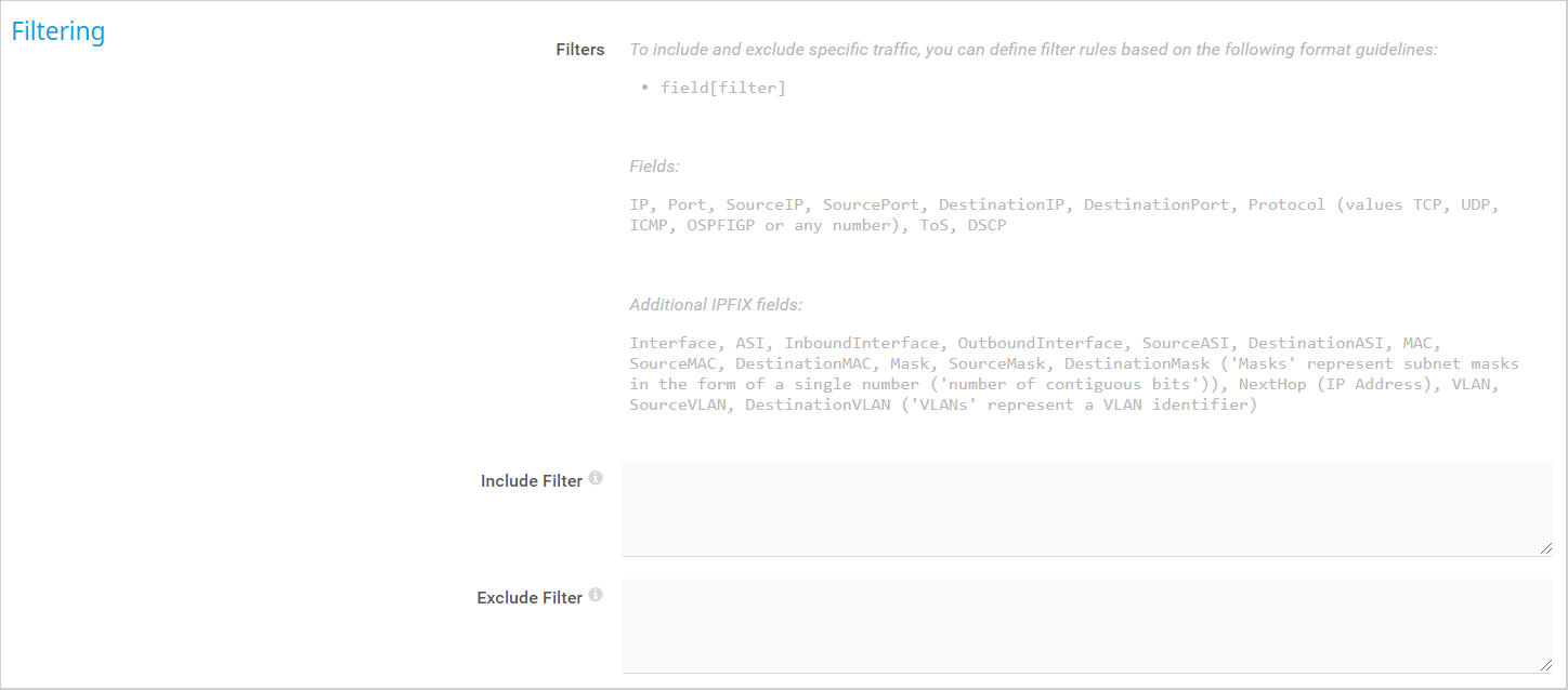 Define if you want to filter any traffic. If you leave this field empty, the sensor includes all traffic. To include specific traffic only, define filters using a special syntax.
