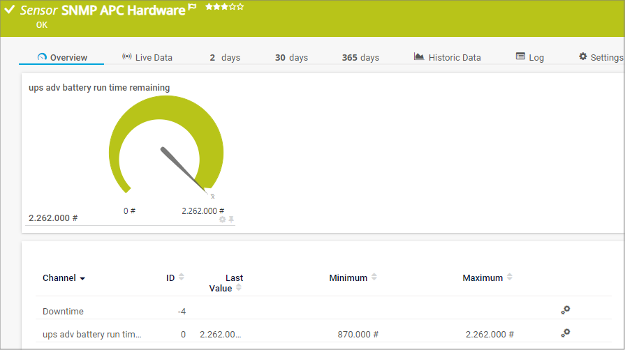 The SNMP APC Hardware sensor monitors performance counters on an APC UPS device via the Simple Network Management Protocol (SNMP).