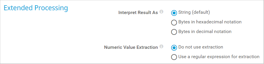 Bytes in hexadecimal notation: Handle the result as bytes in hexadecimal notation. For example, select this option if you monitor MAC addresses.