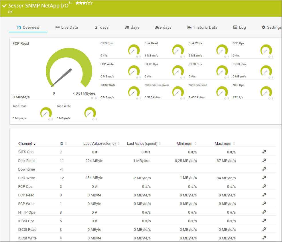 The SNMP NetApp I/O sensor monitors the input/output operations per second (IOPS) on a NetApp storage system via the Simple Network Management Protocol (SNMP).