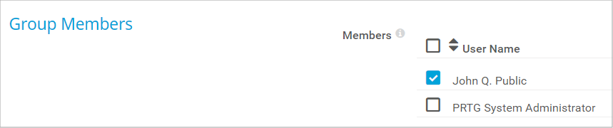 Select the user group whose members can log in to PRTG using their Active Directory domain credentials. The according user accounts have the access rights of the user group you just created.