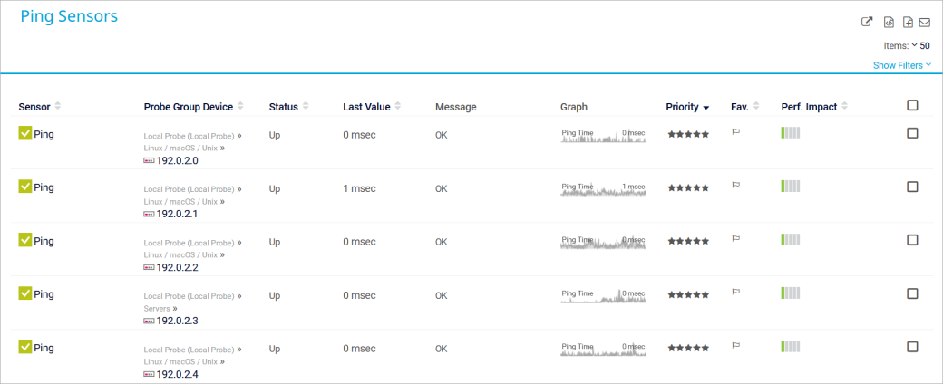 In the PRTG web interface, you often see table lists, for example, sensor or device lists. Table lists are also available in libraries, maps, reports, notifications, and schedules, as well as in logs and tickets. All of these table lists are similar in layout and functionality.